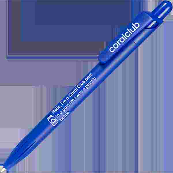 Ballpoint pen with push-button mechanism made of PET-RECYCLED material with the inscription "Hello, I'm a Coral Club pen! In a past life I was a plastic can."